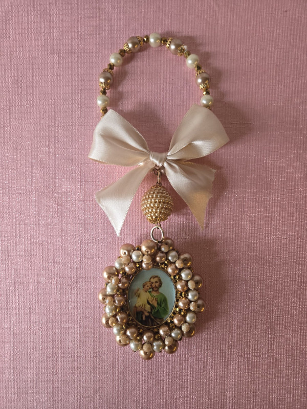A beautiful blessing, ideal for hanging on doors and in your car. This image of Saint Joseph with the Child is printed in color and decorated with synthetic pearls of different sizes and decorations, along with a ribbon bow, creating a perfect color combination.