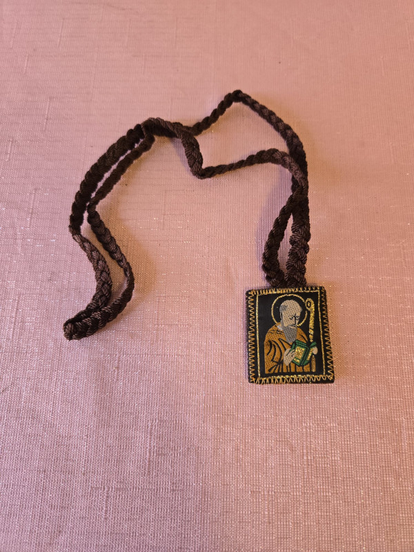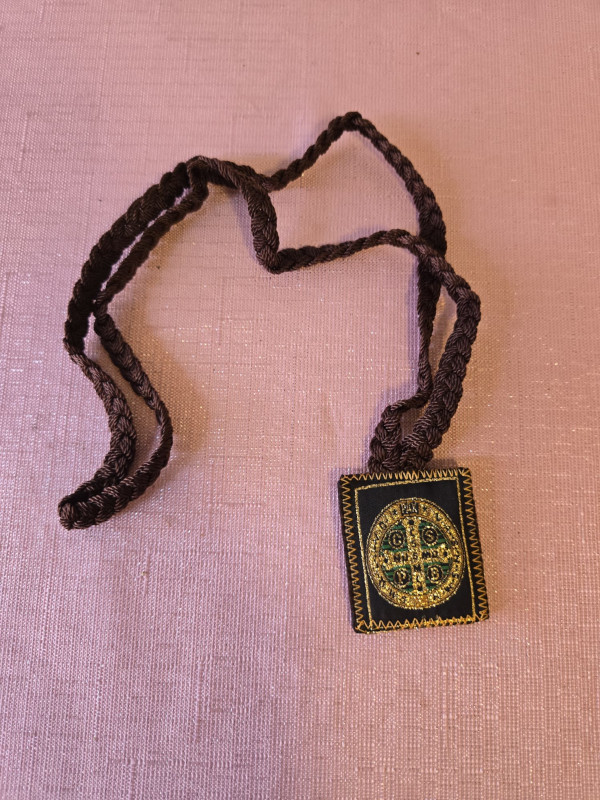 Brown embroidered fabric braided scapular. The front features a half-length image of Saint Benedict, and the back features the cross of Saint Benedict. Scapular badge measures 1.35 inches wide, 1.45 inches high. Scapular wire length: panel to panel: 14.5 inches.