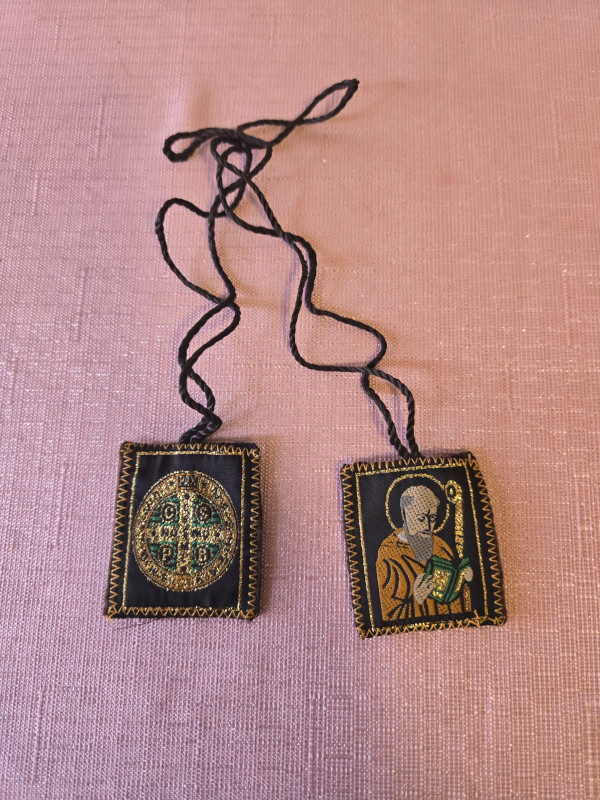 Brown embroidered fabric scapular. The front features a half-length image of Saint Benedict, and the back features the cross of Saint Benedict. Scapular badge measures 1.35 inches wide, 1.45 inches high. Scapular wire length: panel to panel: 14.5 inches.