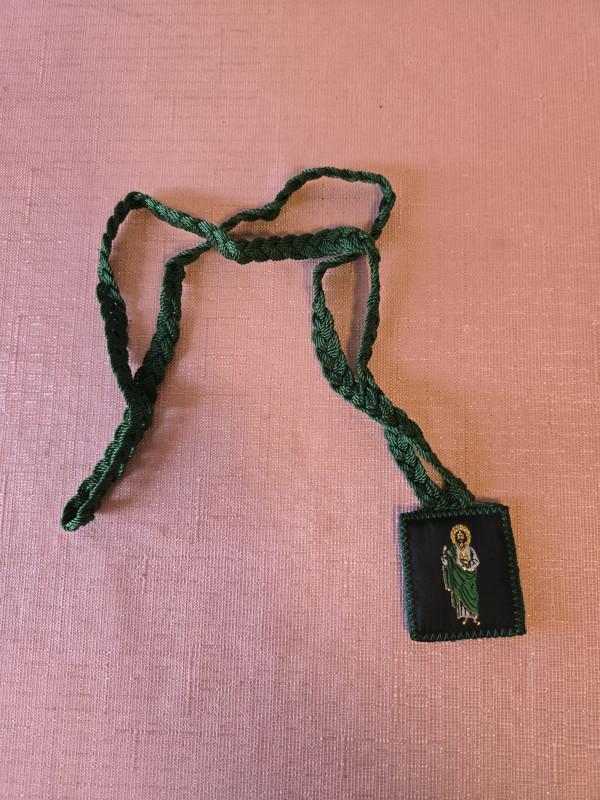 Green embroidered fabric braided scapular. The front features a half-length image of Saint Jude, and the back features Our Lady of Guadalupe. Scapular badge measures 1.35 inches wide, 1.45 inches high. Scapular wire length: panel to panel: 14.5 inches.