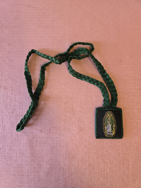 Escapulario de tela color verde bordado En la parte delantera muestra imagen de San Judas, en la parte de atrás la Virgen de Guadalupe. Medidas de la insignia escapular 1.35 pulgadas ancho de la insignia escapular, 1.45 pulgadas alto Longitud del cable escapular: panel a panel 14.5 pulgadas.