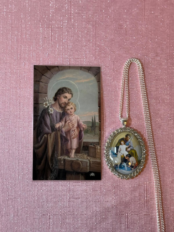 Medal with an image of Saint Joseph holding the child in his arms and a lamb looking over them, and Saint John the Baptist at Saint Joseph’s feet. Includes a steel chain decorated with shiny silver-colored stones. One-sided.