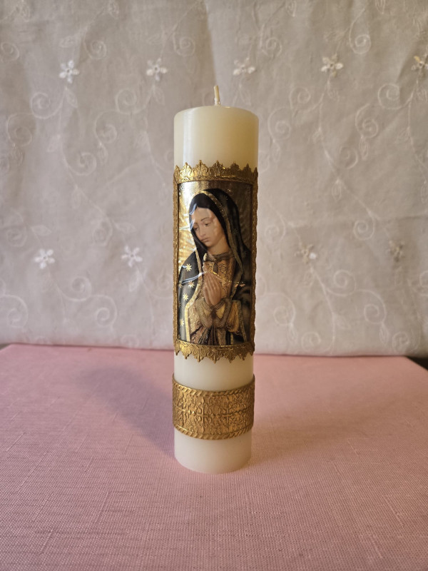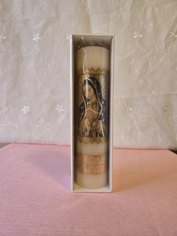 Vela con imagen de la Virgen de Guadalupe, hecha en Mexico, viene en una caja blanca con envoltura transparente.