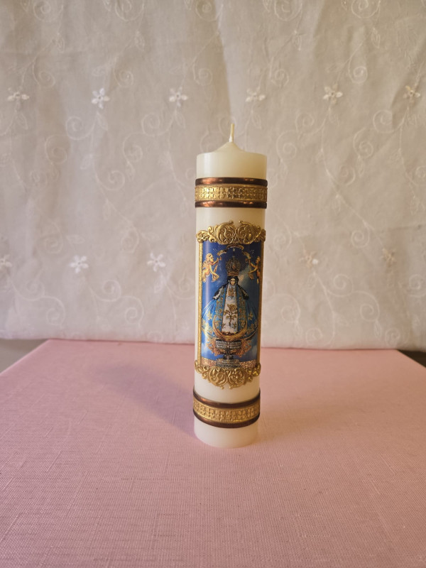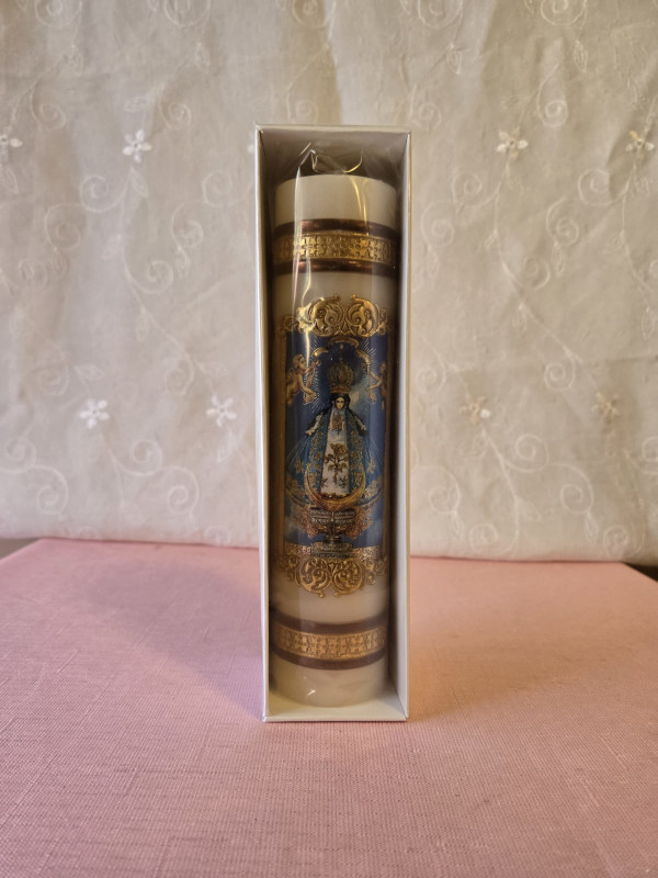 Vela con imagen de la Virgen de San Juan de los Lagos, hecha en Mexico, viene en una caja blanca con envoltura transparente.