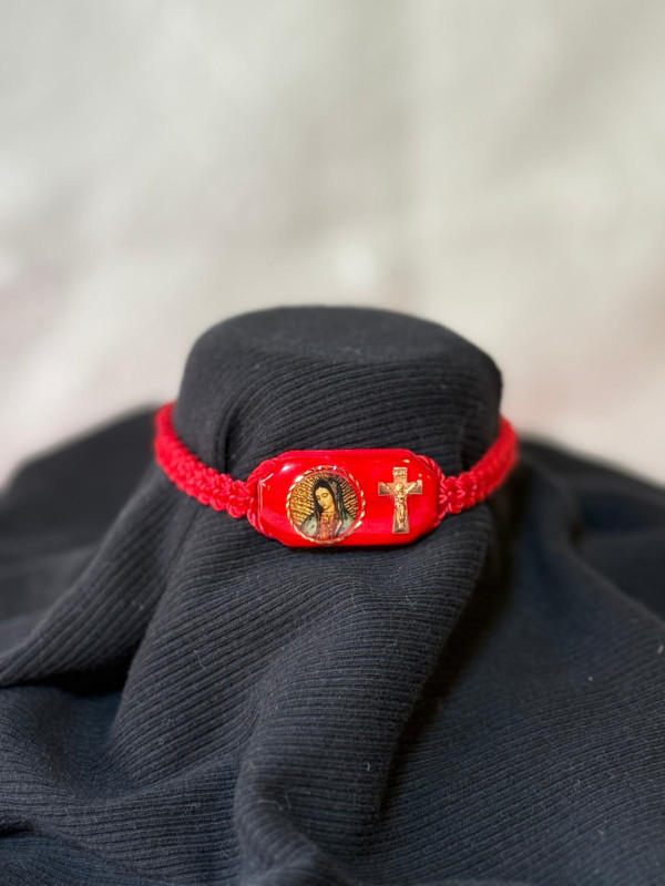 Pulsera de Hilo en color rojo, tamaño ajustable con centro de la imagen de la cara de la Virgen de Guadalupe impresa a colores y la imagen de una cruz al lado.