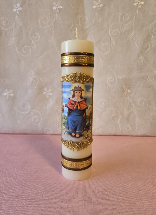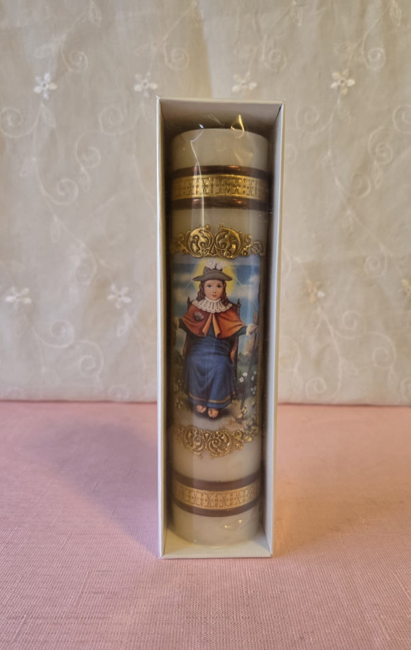 Vela con imagen del Santo Niño de Atocha en colores claros, hecha en Mexico, viene en una caja blanca con envoltura transparente.